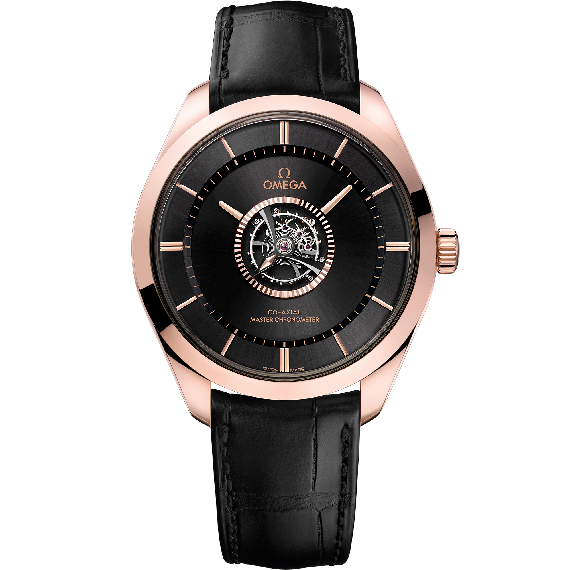 Handcrafted by a select group of horologists at OMEGA’s Atelier Tourbillon in Switzerlandthis extraordinary timepiece is OMEGA’s first-ever manual winding central tourbillon to be Master Chronometer certified. Cased in a blend of 18K Sedna™ gold and 18K Canopus Gold™it features an 18K Sedna™ gold bezel and a sun-brushed dial in the same lustrous material treated with black PVD. Its indexespolished minute and hour hands are in applied 18K Sedna™ gold. An 18K Sedna™ gold polished seconds hand is set in the tourbillon titanium bridge. The crownalso in polished 18K Sedna™ goldfeatures a Ω set in 18K Canopus Gold™. Presented on a black leather strap with polished 18K Sedna™ gold bucklethis exceptional example of the watchmaker's art looks sensational from all anglesas the sapphire crystal caseback allows a view of the 18K Sedna™ gold movement: OMEGA’s Co-Axial Master Chronometer Calibre 2640.