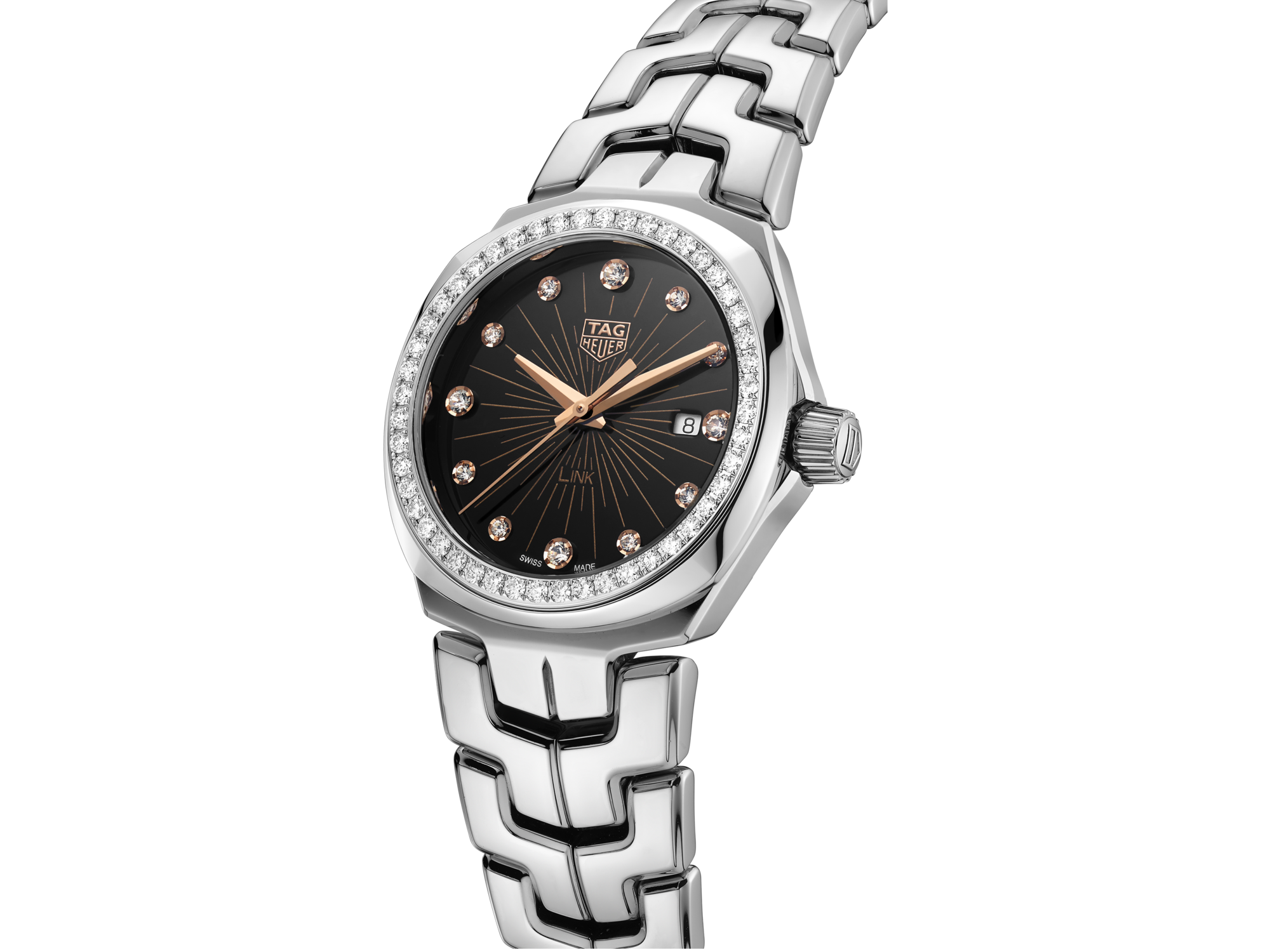 A stunningvery femininediamond (0.116 CT) quartz edition of the Link Lady with white mother-of-pearl dial. The slender32mm case in fine-brushed and polished stainless steelmatched with a polished steel bezel and the iconic S-shape bracelet.