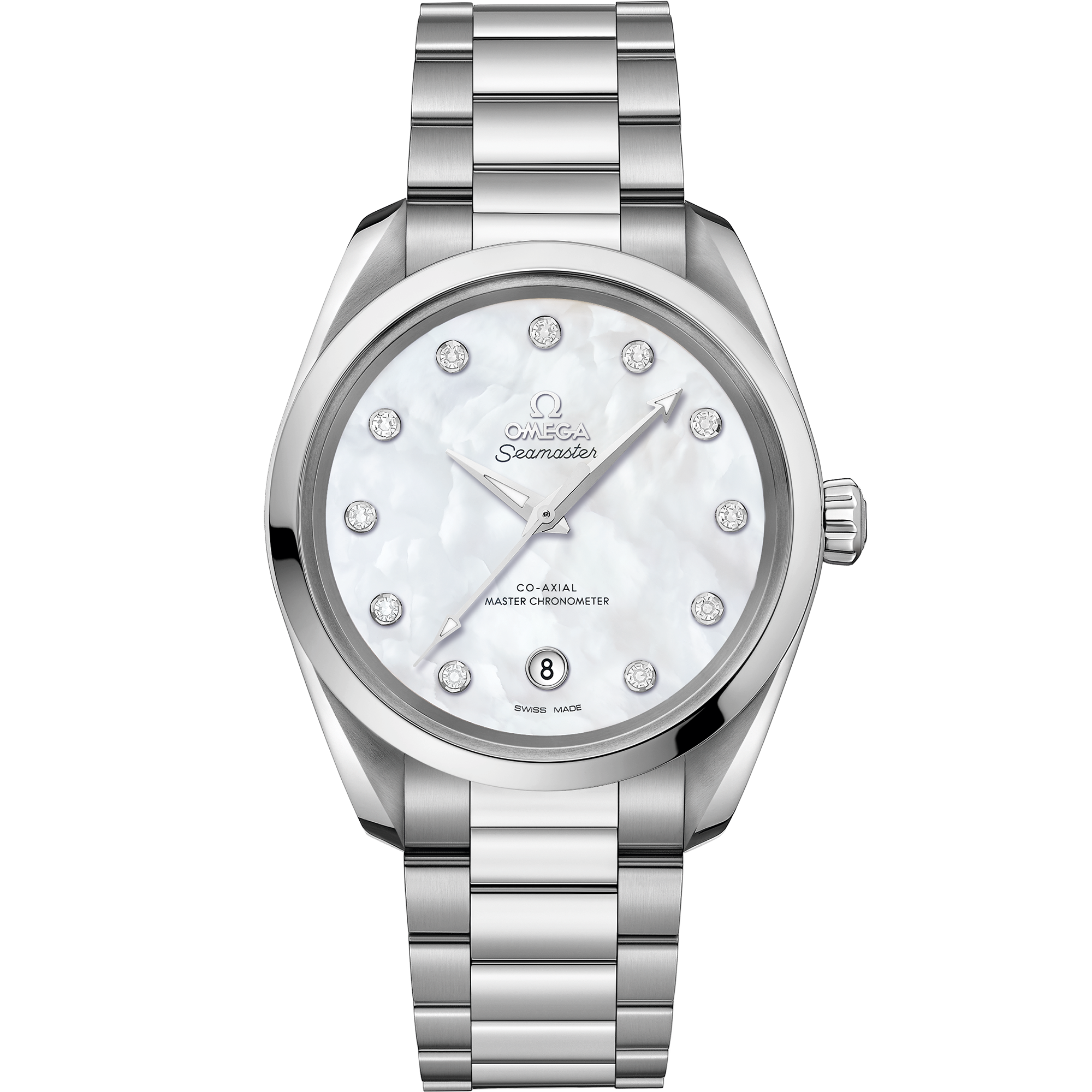 Omega Seamaster Aqua Terra 150M men’s watch with white mother-of-pearl dial, diamond markers and stainless steel bracelet.