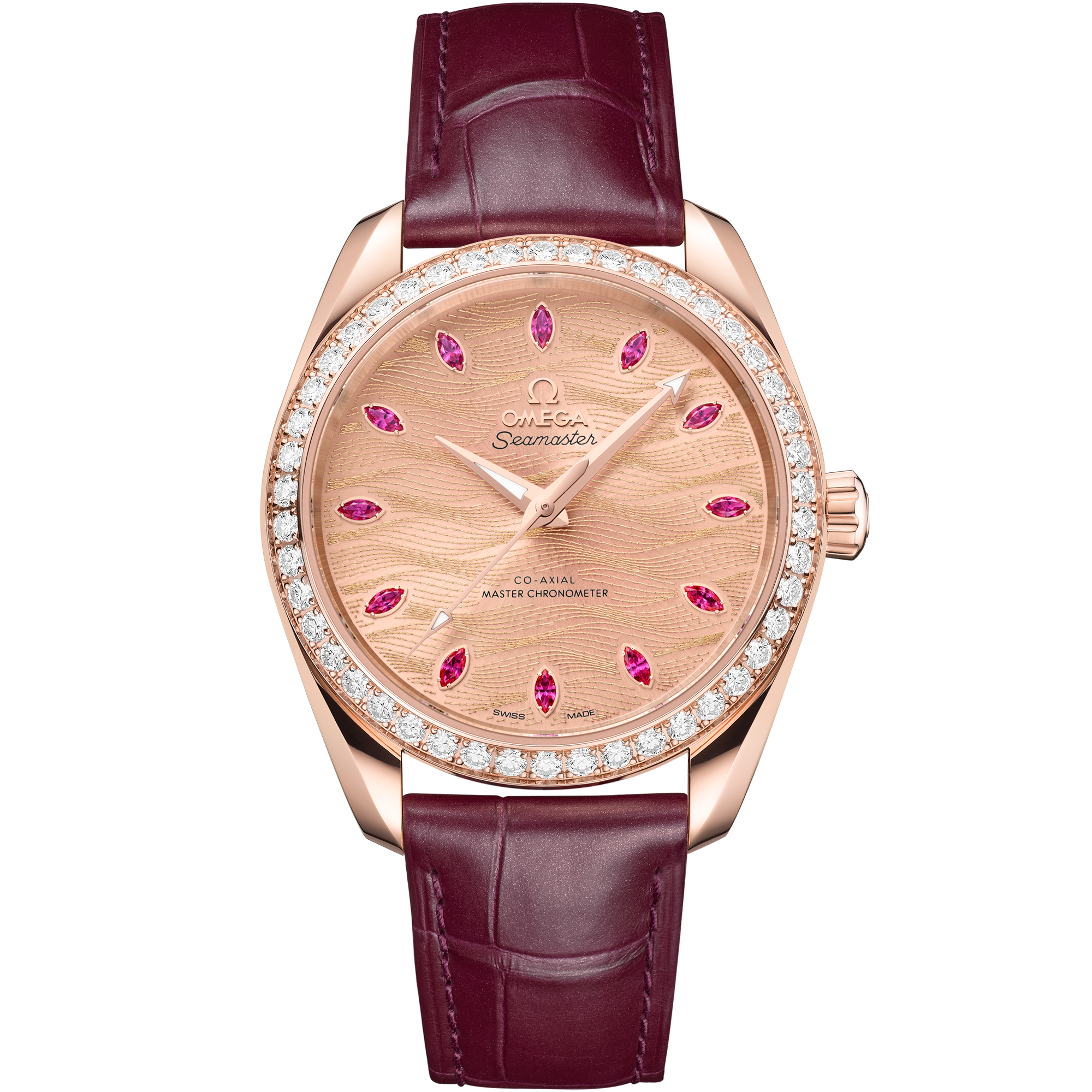Omega Seamaster Aqua Terra 150M rose gold men's watch with diamond bezel and burgundy leather strap