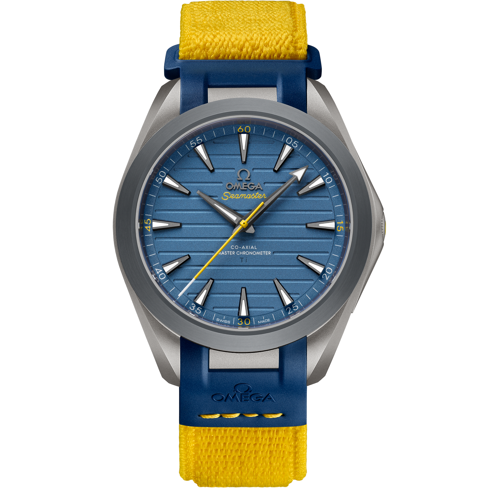 Omega Seamaster Aqua Terra 150M men's watch with blue dial and yellow fabric strap
