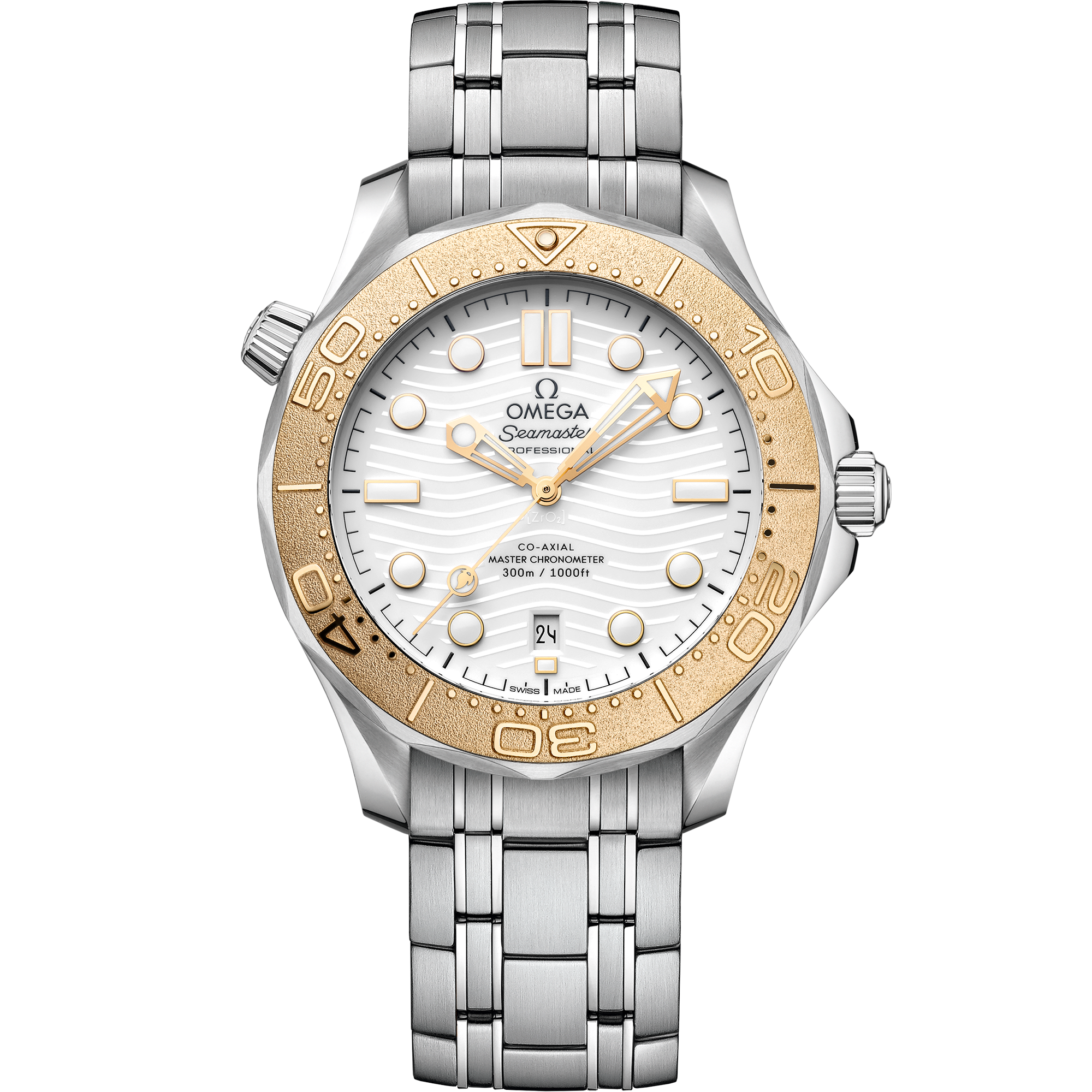 Omega Seamaster Diver 300M men's watch with gold bezel, white dial, and silver bracelet