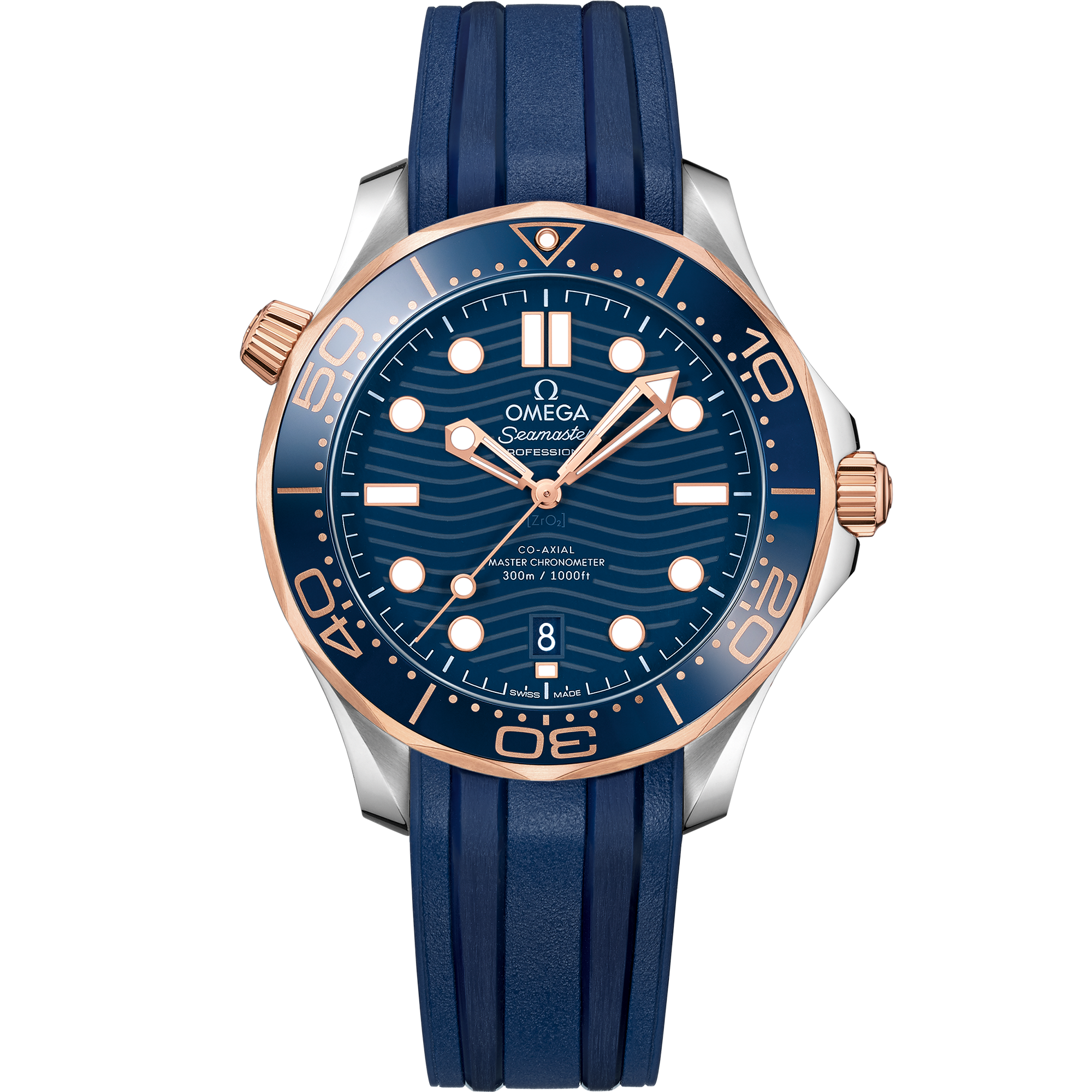 Omega Seamaster Diver 300M men's watch with blue dial, blue rubber strap, rose gold accents