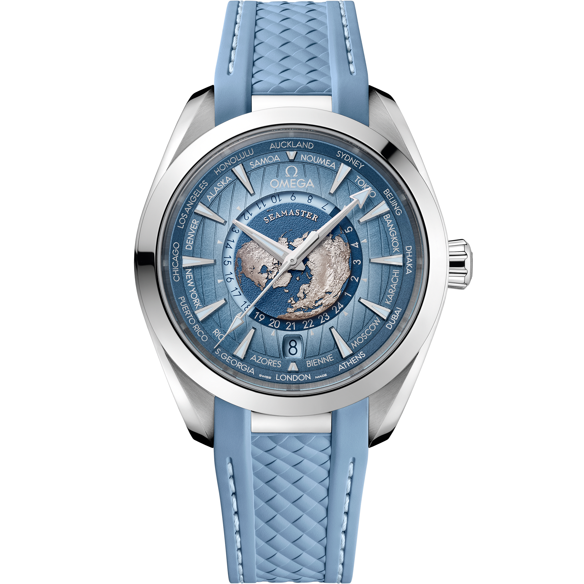Omega Seamaster Aqua Terra Worldtimer men's luxury watch with blue strap and detailed world map dial