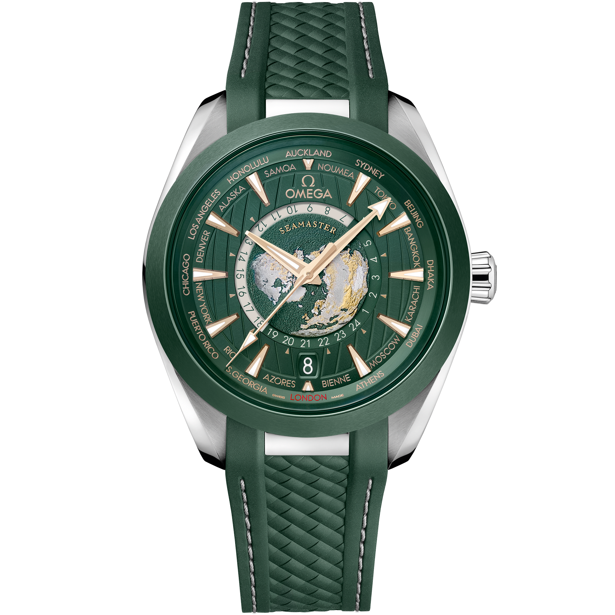 Omega Seamaster Aqua Terra green men's worldtimer watch with textured strap and globe dial