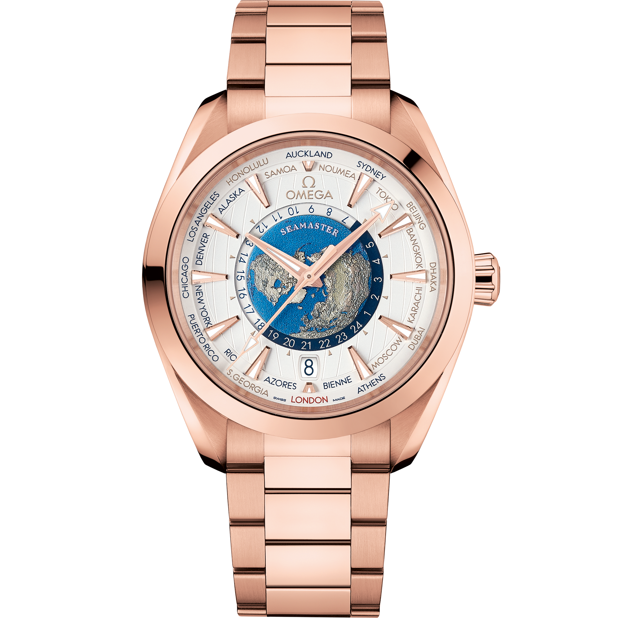 Omega Seamaster Aqua Terra rose gold men's watch with worldtimer dial, featured on OM Tempus.