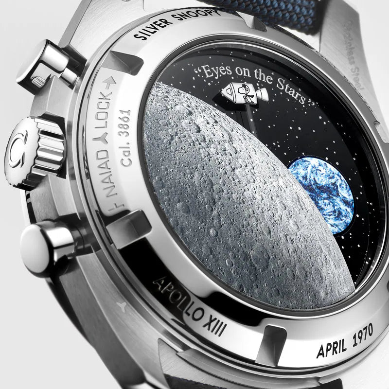 The NAIAD LOCK keeps all caseback engravings in the correct, upright position, including tributes to Apollo 13 and the Silver Snoopy Award. 0MEGA received the prize seven months after the Speedmaster helped to rescue the Apollo 13 crew.