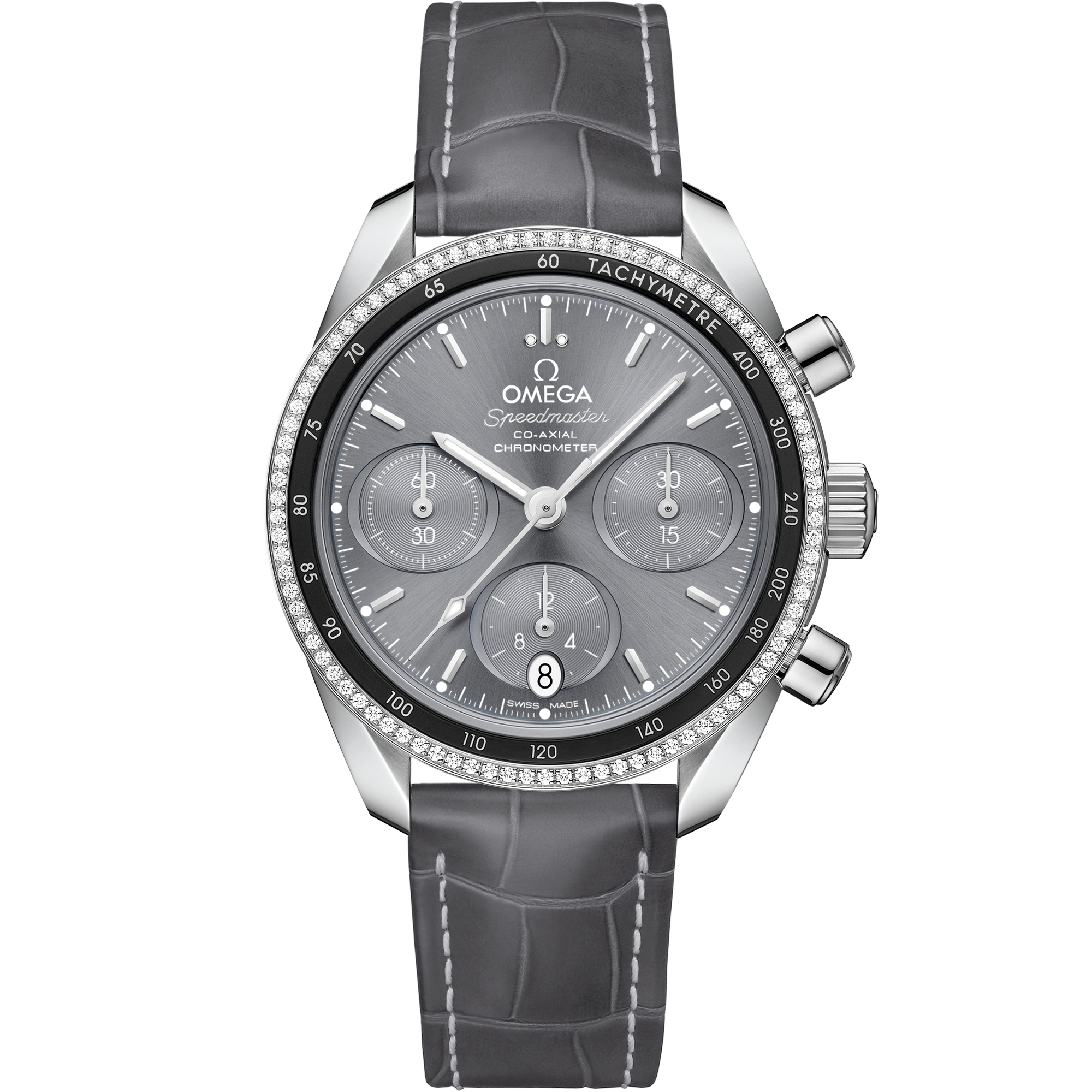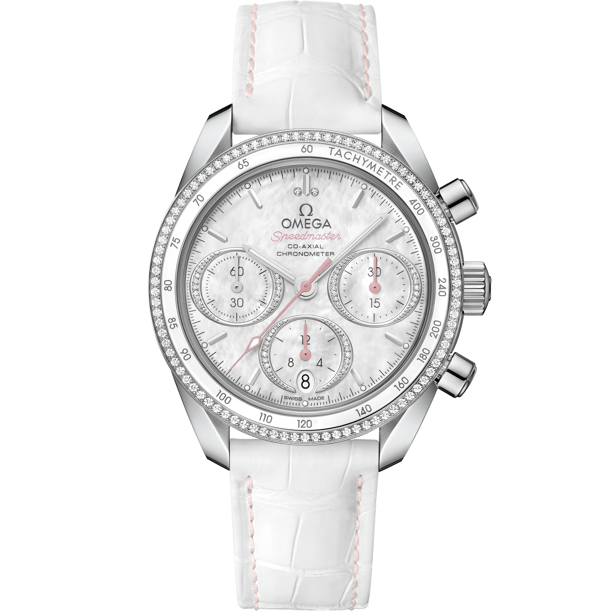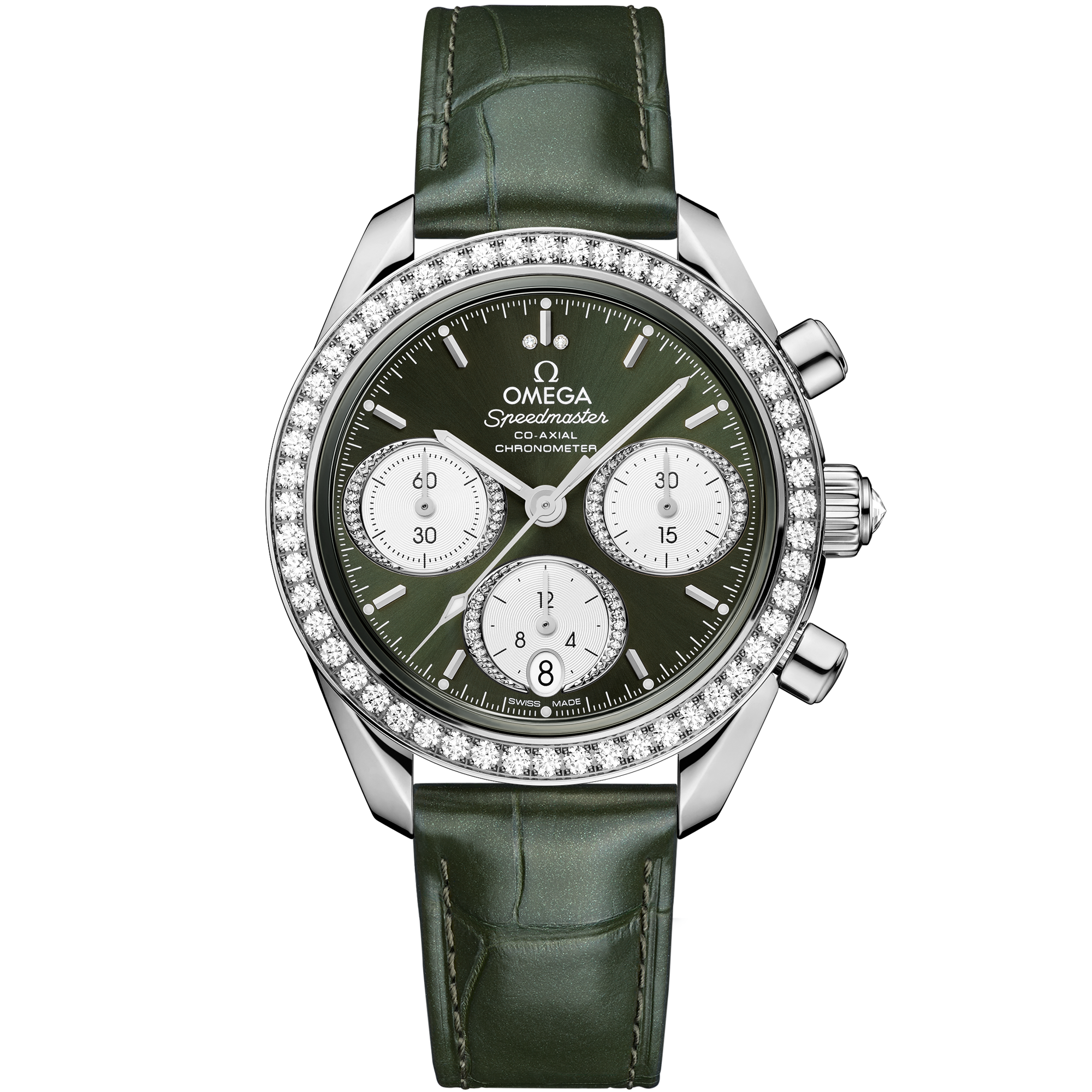 The Speedmaster 38 mm collection has been crafted with simplicitysize and colour in mindyet still retains the look and heritage of OMEGA’s most famous chronograph. This model features a full 18K Sedna™ gold case with a dual bezel design. The inner section of the bezel features a tachymeter scale on a brown aluminium ring while the outside is diamond-paved. The “cappuccino” dial includes horizontal brown oval subdials and a vertical oval date window at 6 o’clock. The indexes and hands are made of 18K Sedna™ gold with white Super-LumiNova on the the hourminute and chronograph seconds hands. The watch has a taupe-brown leather strapa Seahorse medallion on the casebackand is driven by the OMEGA Co-Axial Calibre 3330.
